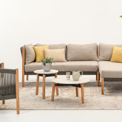 Wie der Name schon sagt, geht es bei der Kollektion "Lento" (italienisch für langsam) um Langsamkeit. La dolce vita zu geniessen, während man Dinge tut, die einem wichtig sind, ist genau das, was der belgische Designer Bertrand Lejoly beim Entwurf der Lento-Kollektion im Sinn hatte. Die auffälligen Outdoor-Möbel zeichnen sich durch einen Mix aus natürlichem Teakholz, taktilem Polypropylenseil und bequemen Kissen aus, die sich in einem niedrigschwingenden Design vereinen. Während das Gesamtbild entspannt und locker wirkt, verleihen die massiven Teakholzbeine und die hohen geflochtenen Seilrücken der Kollektion eine reiche und einnehmende Persönlichkeit. Das anthrazitfarbene Seil und das warme Teakholz passen perfekt zu den Lento Couch- und Beistelltischen. Die Tische sind mit einer hellen Keramikplatte versehen, die ein grosszügiges Raumgefühl vermittelt und gleichzeitig für Struktur sorgt. Lassen Sie sich in den bequemen Stühlen nieder und entspannen Sie sich in Ihrem eigenen Kokon der Gemütlichkeit.