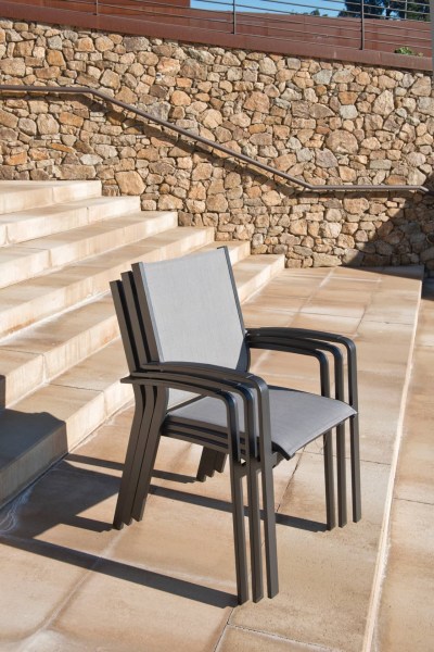 Diese stapelbare Cosmo Armlehnstühle mit modernem Design wird Ihre Terrasse oder Ihren Garten aufwerten. Es ist mit Sling-Gewebe bezogen, einem industriell gefertigten, geflochtenen PVC-Stoff, das einer Vordehnung unterzogen wird, um die Spannung zu erhalten, wenn es an den Armlehnstuhl angebracht wird. Es ist ein atmungsaktiver, UV-beständiger und witterungsfester Stoff. Der Cosmo Armlehnstuhl ist pflegeleicht und in fünf Farben erhältlich: anthrazit, silbergrau/weiss, taupe/weiss, beige oder weiss. Ihre durchdachten Sitzflächen und Armlehnen sorgen einfach für Komfort. Er besteht aus einem pulverbeschichteten Aluminiumrahmen, der für eine lange Nutzungsdauer gegen Rost und UV-Strahlen behandelt wurde.