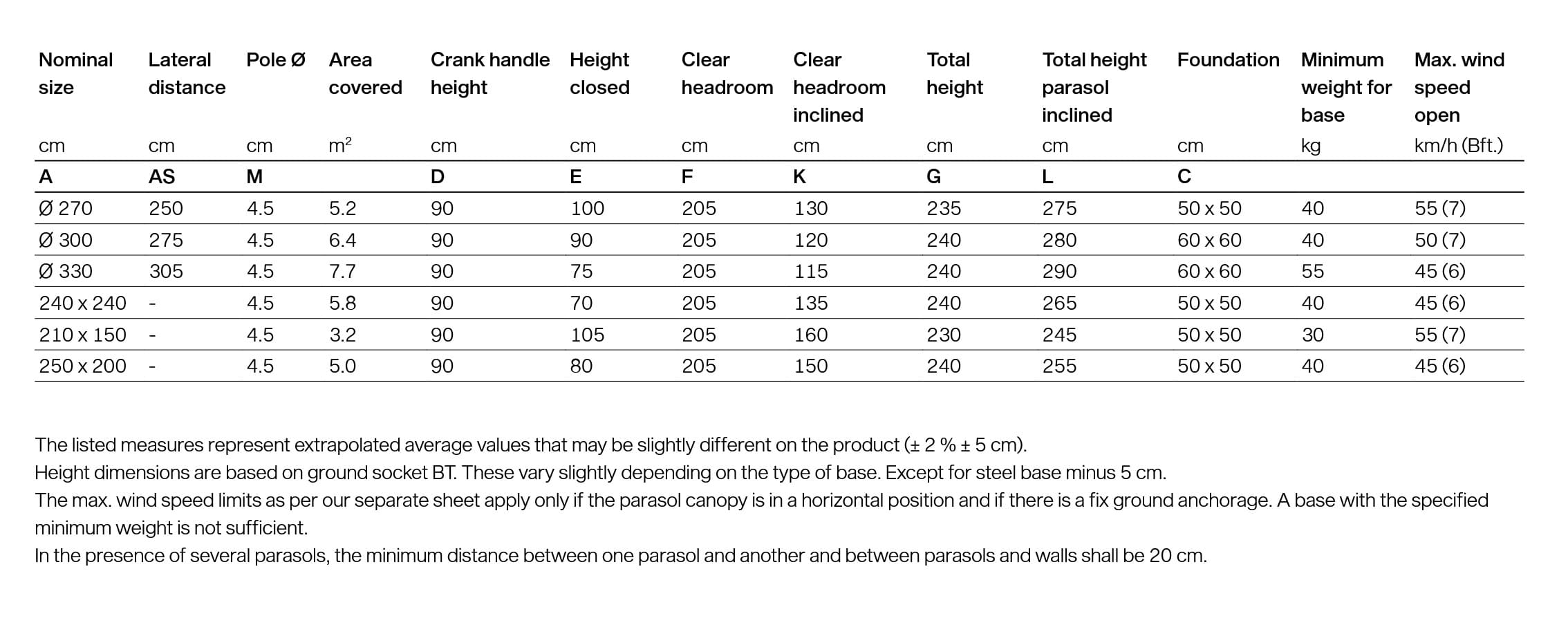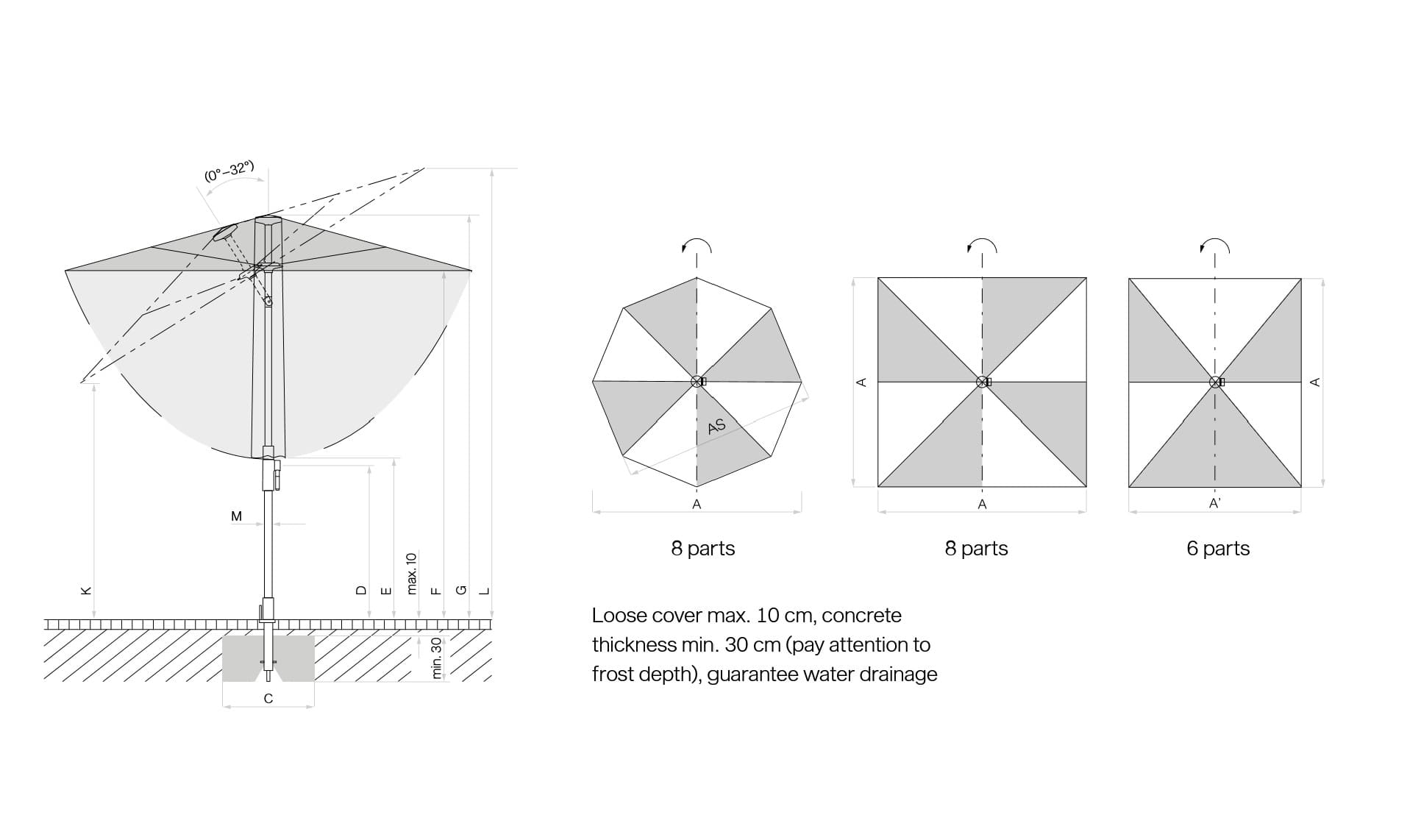 Bitte beachten Sie die Tabelle hier für die Auswahl der richtigen Sockel mit der Grösse des Glatz Vita Torna Sonnenschirm.